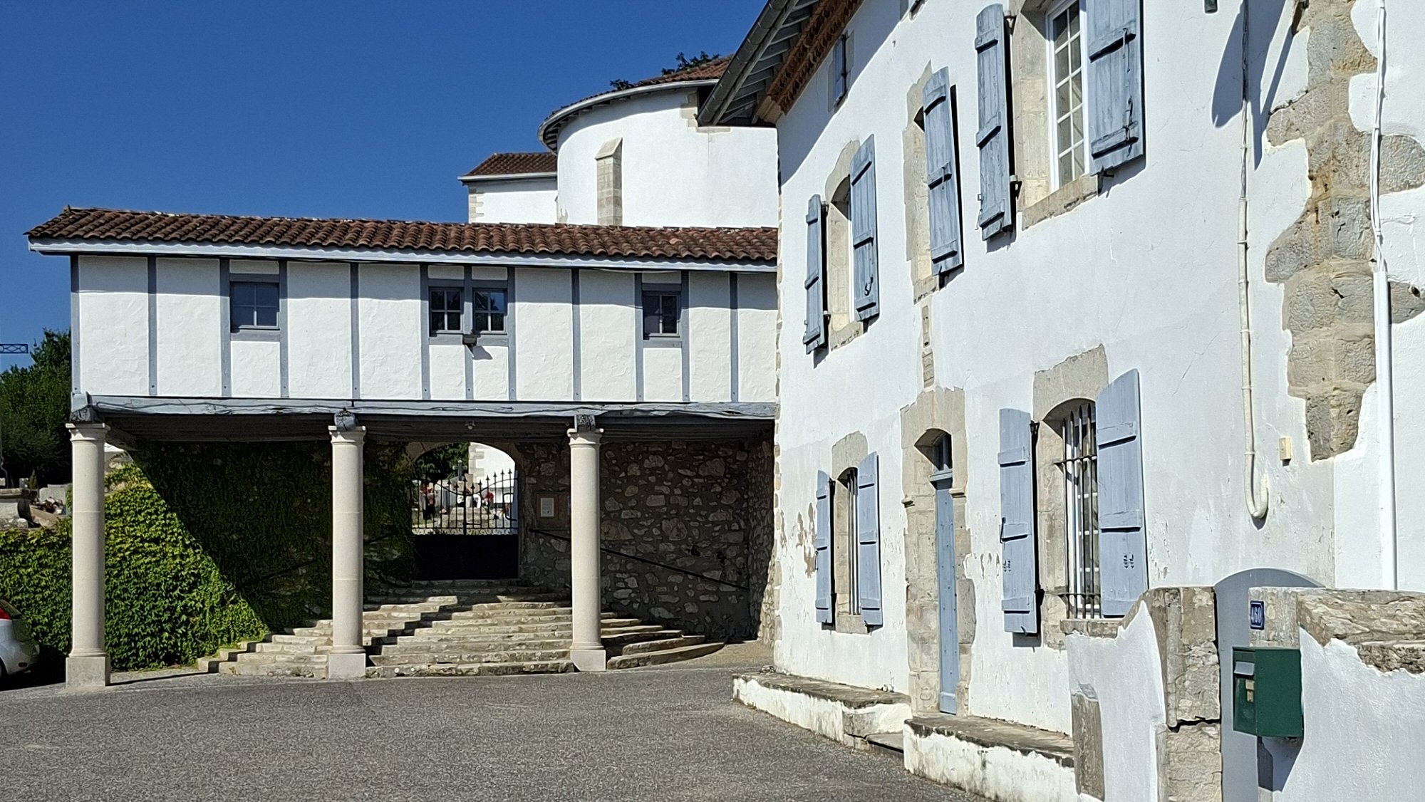 Bourg de Guiche : la place, le pigeonnier, la maison Saint-Jean. À l’arrière-plan, le cimetière et l’église.